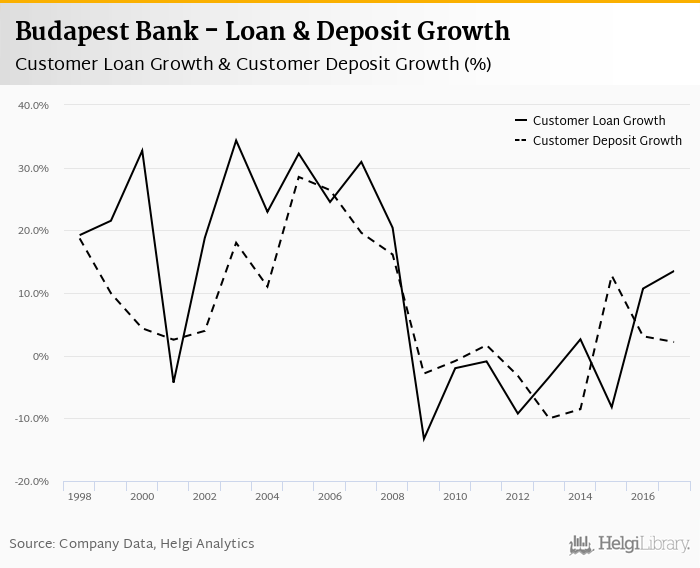Budapest Bank's customer loan growth reached 13.5% in 2017, up from 10.7% compared to the previous year. Historically, the bank’s loans growth reached an all time high of 34.3% in 2003 and an all time low of -13.3% in 2009. In the last decade, the average annual loan growth amounted to 0.510%.