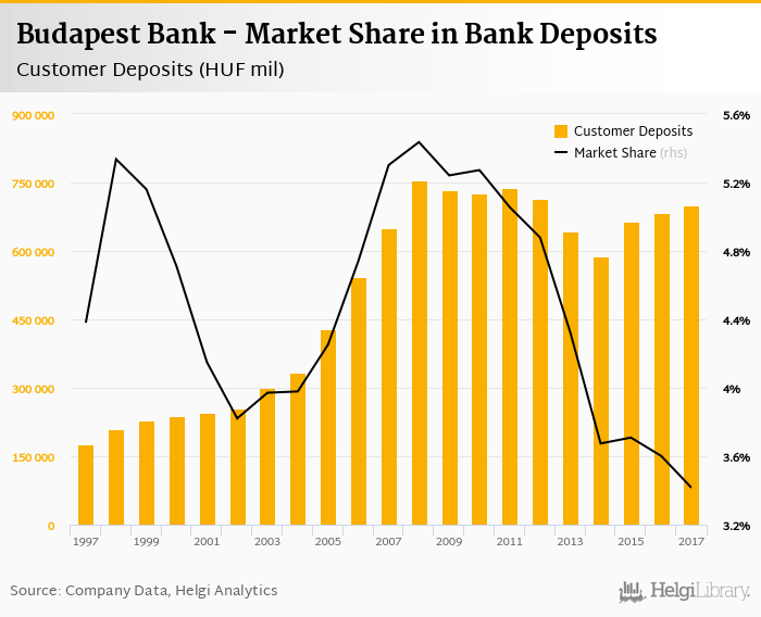 Budapest Bank's customer deposits reached HUF 699,155 mil in 2017, up 2.18% compared to the previous year.