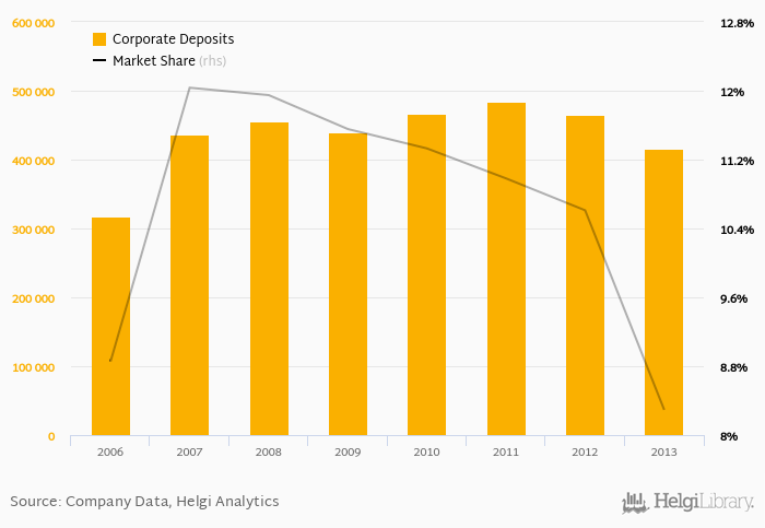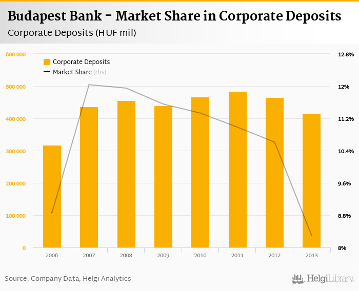 Budapest Bank accounted for 8.29% of all corporate deposits taken by banks in Hungary at the end of 2013. Historically, the bank’s market share in corporate deposits reached an all time high of 12.0% in 2007 and an all time low of 8.29% in 2013.