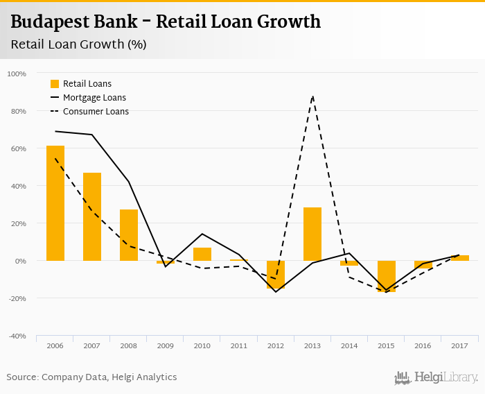 Budapest Bank's retail loans reached HUF 290,416 mil at the end of 2017, up 2.86% compared to the previous year. In the last decade, the average annual loan growth amounted to 1.75%.