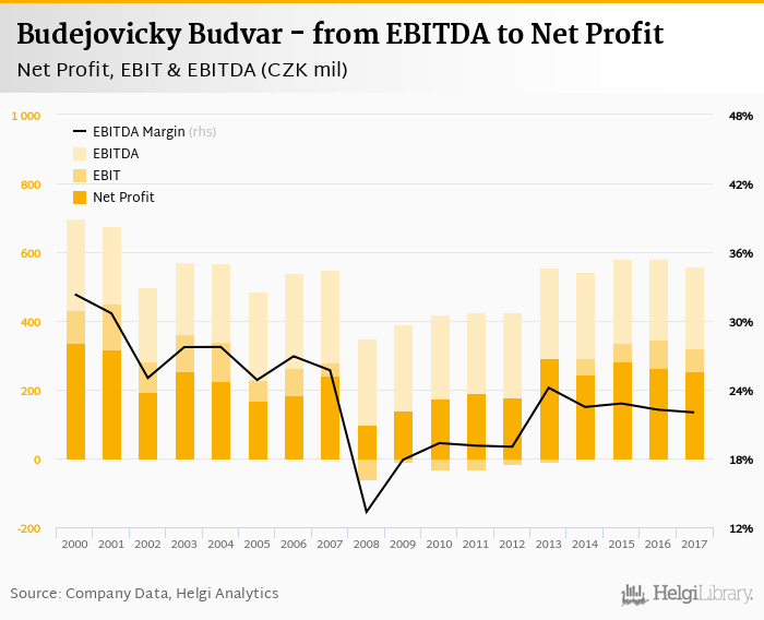 Budejovicky Budvar made a net profit of CZK 255 mil with revenues of CZK 2,543 mil in 2017, down by 3.58% and down by 2.63%, respectively, compared to the previous year. This translates into a net margin of 10.0%.