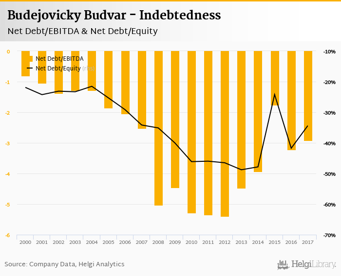 Budejovicky Budvar's net debt stood at CZK -1,634 mil and accounted for -34.4% of equity at the end of 2017. The ratio is up 7.37 pp compared to the previous year.