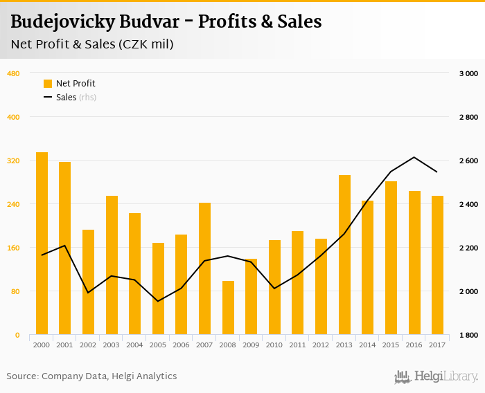 Budejovicky Budvar made a net profit of CZK 255 mil in 2017, down 3.58% compared to the previous year. Total sales reached CZK 2,543 mil, which is down 2.63% when compared to the previous year.