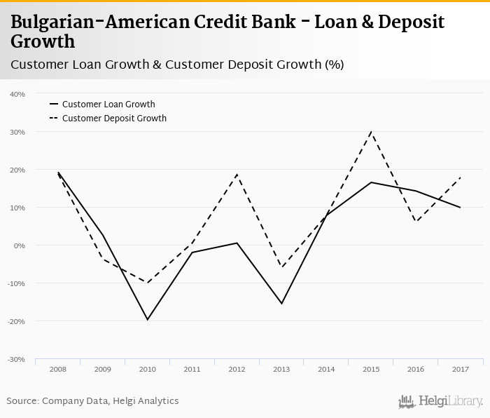 Bulgarian-American Credit Bank's customer loan growth reached 9.81% in 2017, down from 14.2% compared to the previous year. Historically, the bank’s loans growth reached an all time high of 19.2% in 2008 and an all time low of -19.7% in 2010. In the last decade, the average annual loan growth amounted to 0%.