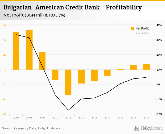 Bulgarian-American Credit Bank made a net profit of BGN 7.87 mil in 2017, up 30.7% compared to the previous year. This implies a return on equity of 4.59%.