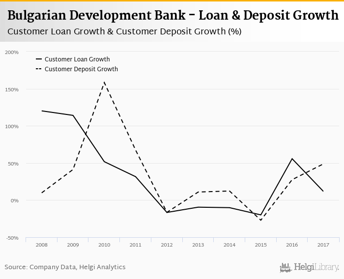 Bulgarian Development Bank's customer loan growth reached 11.7% in 2017, down from 55.7% compared to the previous year. Historically, the bank’s loans growth reached an all time high of 120% in 2008 and an all time low of -19.9% in 2015. In the last decade, the average annual loan growth amounted to 0%.