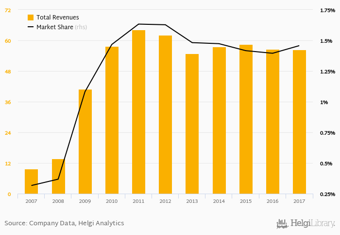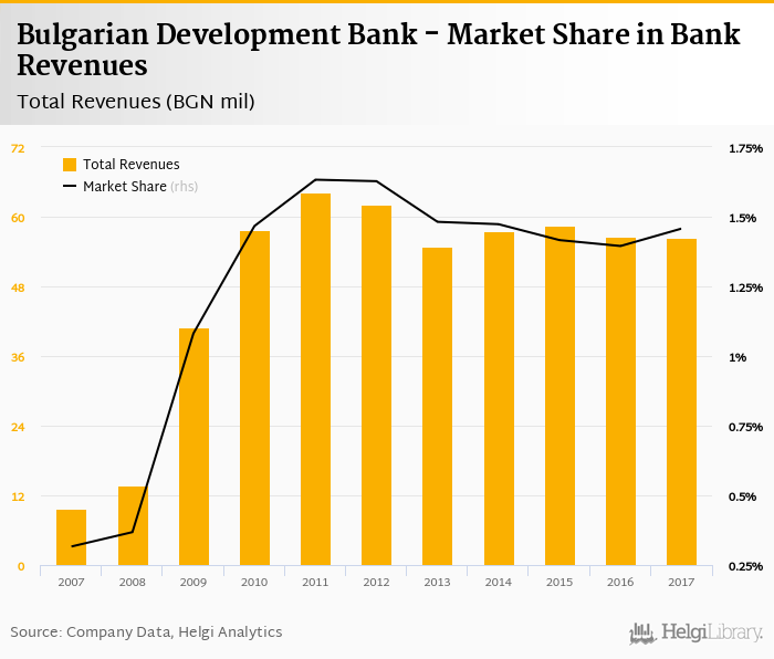 As a result, Bulgarian Development Bank accounted for 1.46% of all bank revenues generated by banks in Bulgaria in 2017. Historically, the bank’s market share in total revenues reached an all time high of 1.63% in 2011 and an all time low of 0.316% in 2007.
