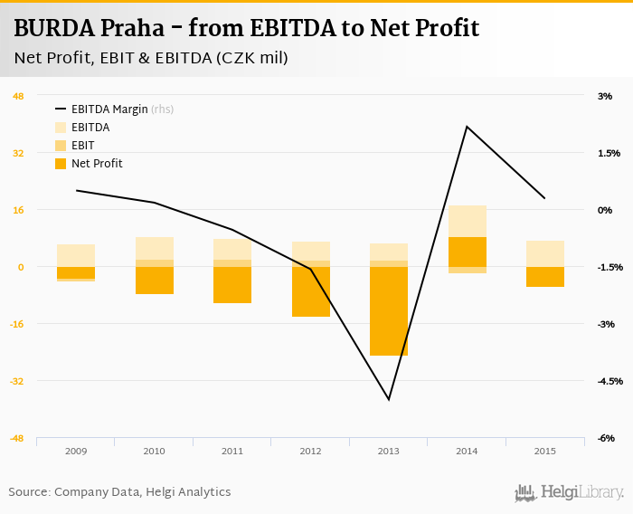 BURDA Praha made a net profit of CZK -5.59 mil with revenues of CZK 630 mil in 2015, down by 167% and down by 12.6%, respectively, compared to the previous year. This translates into a net margin of -0.887%.