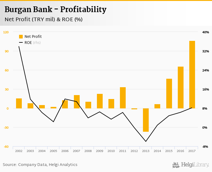 Burgan Bank made a net profit of TRY 106 mil in 2017, up 62.4% compared to the previous year. This implies a return on equity of 8.15%.