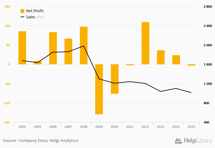 Sales have fallen by 4.69% a year on average since 2005. They reached a high of CZK 1,975 mil in 2008 and a low of CZK 1,007 mil in 2015.
