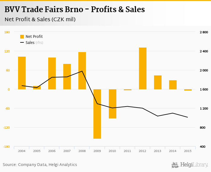 BVV Trade Fairs Brno made a net profit of CZK -3.75 mil in 2015, down 113% compared to the previous year. Total sales reached CZK 1,007 mil, which is down 7.97% when compared to the previous year.