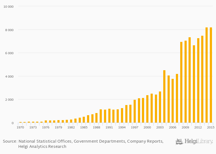 Historically, cadmium production in China reached an all time high of 8,201 tonnes in 2014 and an all time low of 80.0 tonnes in 1970.