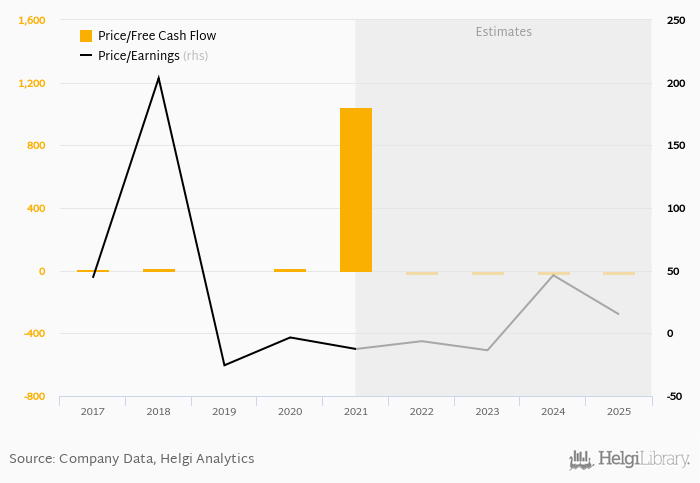 At the end of 2021, the firm traded at price to earnings of -12.5x. Over the last five years, this multiple achieved a high of 204x in 2018 and a low of -25.5x in 2019 with an average of 41.3x.