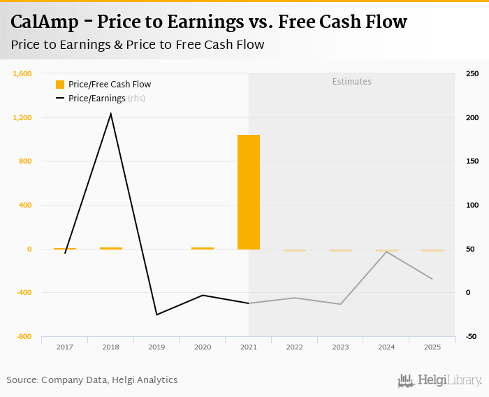 Regarding cash generated defined by the sum of net profit and depreciation, the stock traded at -28.0x at the end of 2021. When investments are excluded to get free cash flow, CalAmp traded at 1,043x.
