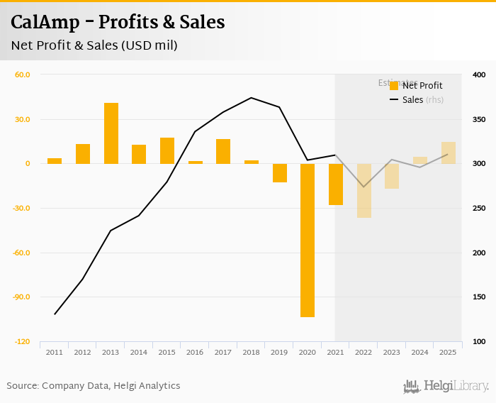 CalAmp made a net profit of USD -27.5 mil in 2021, up 73.4% compared to the previous year. Total sales reached USD 309 mil, which is up 1.87% when compared to the previous year.