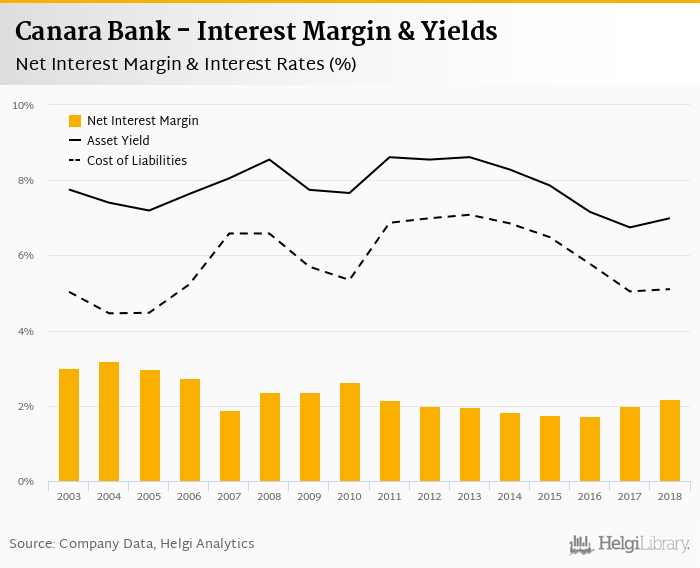 Canara Bank's net interest margin amounted to 2.17% in 2018, up from 2.00% compared to the previous year.