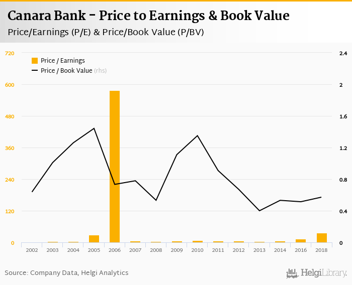 Canara Bank stock traded at INR 298 per share at the end 2018 implying a market capitalization of USD 3,144 mil.
