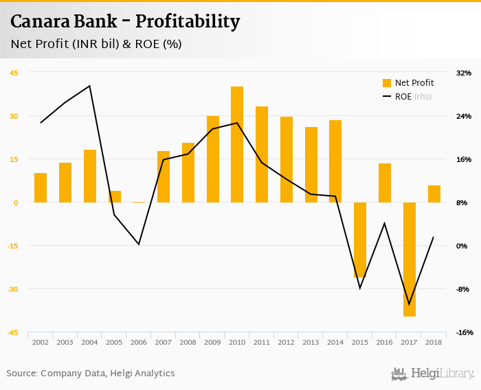 Canara Bank made a net profit of INR 6.02 bil in 2018, up 115% compared to the previous year. This implies a return on equity of 1.59%.