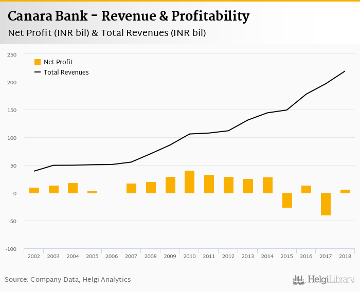 Canara Bank made a net profit of INR 6.02 bil under revenues of INR 219 bil in 2018, up 115% and 11.7% respectively compared to the previous year.