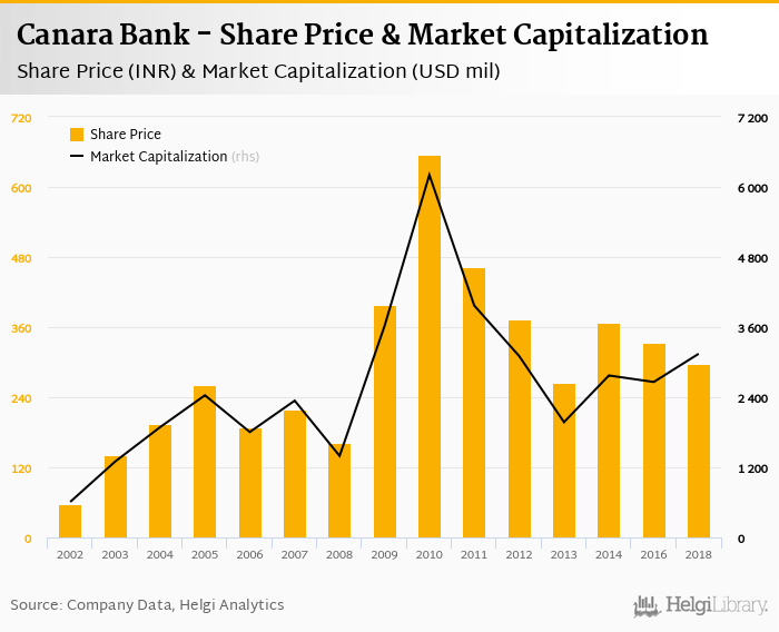 Canara Bank stock traded at INR 298 per share at the end of 2018 implying a market capitalization of USD 3,144 mil.