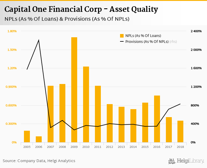 Capital One Financial Corp's non-performing loans reached 0.353% of total loans at the end of 2018, down from 0.412% compared to the previous year. Historically, the NPL ratio hit an all time high of 1.70% in 2009 and an all time low of 0.103% in 2006.