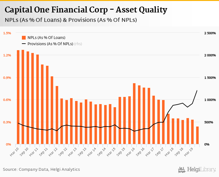 Capital One Financial Corp's non-performing loans reached 0.240% of total loans at the end of 2019-06-30, down from 0.349% compared to the previous year. Historically, the NPL ratio hit an all time high of 1.27% in 2010-06-30 and an all time low of 0.240% in 2019-06-30.