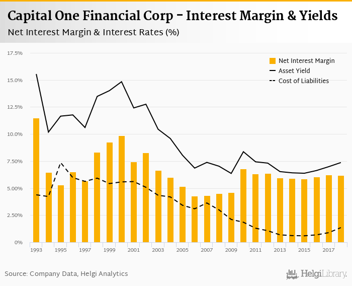 Capital One Financial Corp's net interest margin amounted to 6.20% in 2018, down from 6.22% compared to the previous year.