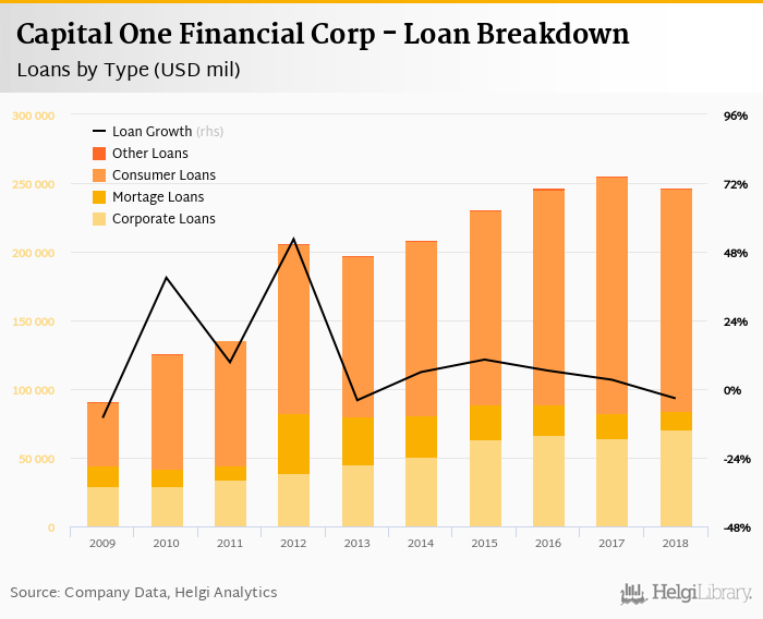 Capital One Financial Corp's loans reached USD 247,091 mil in the 2018, down from USD 255,444 mil compared to the previous year. Historically, the bank’s loans reached an all time high of USD 255,444 mil in 2017 and an all time low of USD 90,887 mil in 2009.