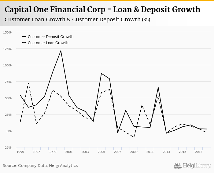 Capital One Financial Corp's customer loan growth reached -3.26% in 2018, down from 3.25% compared to the previous year. Historically, the bank’s loans growth reached an all time high of 72.5% in 1996 and an all time low of -10.1% in 2009. In the last decade, the average annual loan growth amounted to 9.53%.
