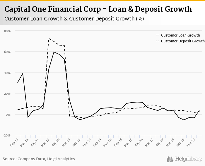 Capital One Financial Corp's customer loan growth reached 3.87% in 2019-06-30, up from -3.23% compared to the previous year. Historically, the bank’s loans growth reached an all time high of 59.6% in 2012-06-30 and an all time low of -5.53% in 2018-09-30. In the last decade, the average annual loan growth amounted to 0%.