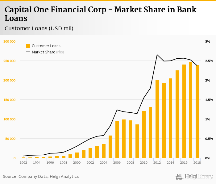 Capital One Financial Corp accounted for 2.37% of all customer loans issued in USA at the end of 2018. Historically, the bank’s market share in customer loans reached an all time high of 2.65% in 2012 and an all time low of 0.045% in 1992.