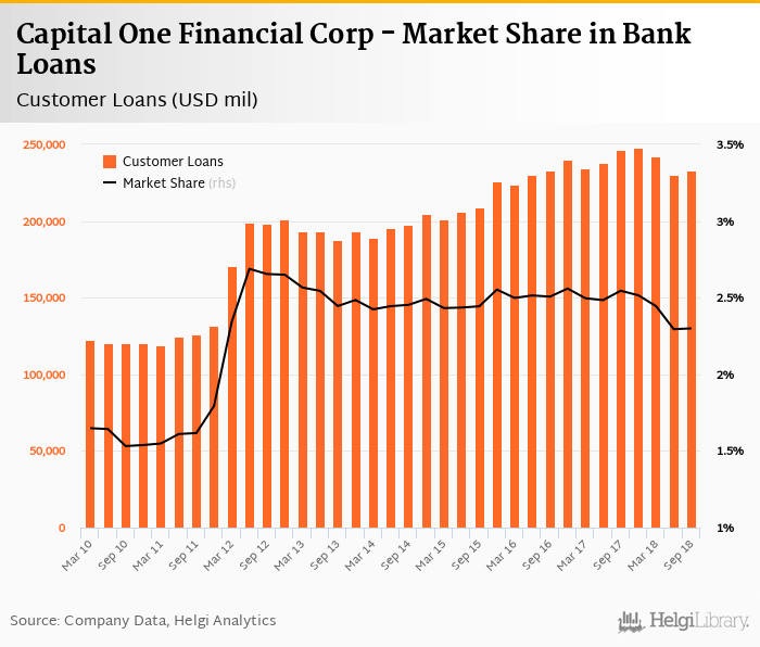 Capital One Financial Corp accounted for 2.30% of all customer loans issued in USA at the end of 2018-09-30. Historically, the bank’s market share in customer loans reached an all time high of 2.69% in 2012-06-30 and an all time low of 1.53% in 2010-09-30.