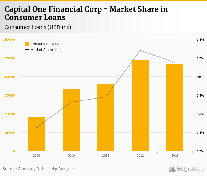 Capital One Financial Corp accounted for 1.15% of all consumer loans issued in USA at the end of 2013. Historically, the bank’s market share in consumer loans reached an all time high of 1.28% in 2012 and an all time low of 0.448% in 2009.