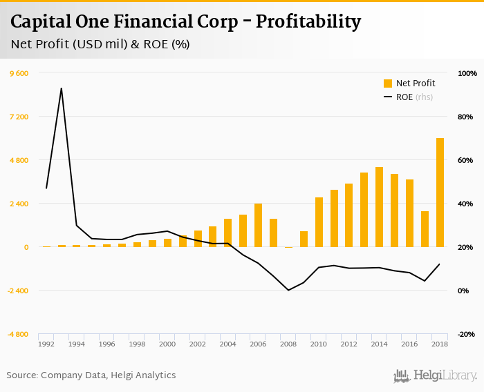 Capital One Financial Corp made a net profit of USD 6,015 mil in 2018, up 203% compared to the previous year. This implies a return on equity of 12.0%.