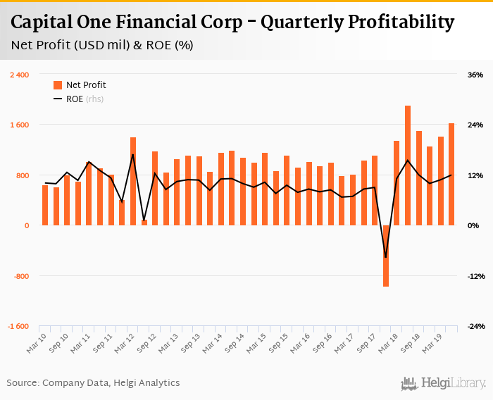 Capital One Financial Corp made a net profit of USD 1,625 mil in the second quarter of 2019, down 14.7% when compared to the same period of last year. This implies a return on equity of 11.9%.