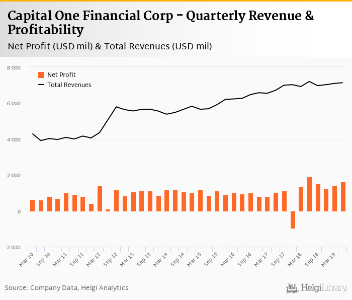 Capital One Financial Corp made a net profit of USD 1,625 mil under revenues of USD 7,124 mil in the second quarter of 2019, down 14.7% and 0.945% respectively when compared to the same period last year.