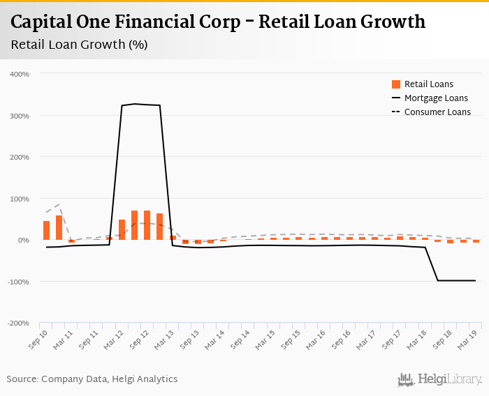 Capital One Financial Corp's retail loans reached USD 169,084 mil at the end of 2019-03-31, down 3.69% compared to the previous year. In the last decade, the average annual loan growth amounted to 0%.