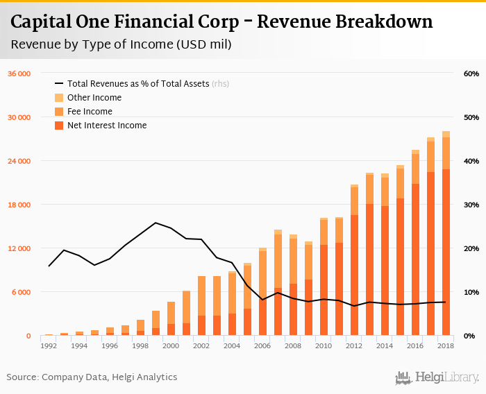 Capital One Financial Corp generated total banking revenues of USD 28,076 mil in 2018, up 3.08% compared to the previous year.