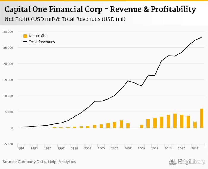 Capital One Financial Corp made a net profit of USD 6,015 mil under revenues of USD 28,076 mil in 2018, up 203% and 3.08% respectively compared to the previous year.