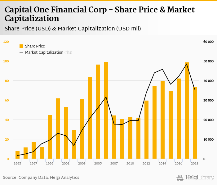 Capital One Financial Corp stock traded at USD 73.2 per share at the end of 2018 implying a market capitalization of USD 35,355 mil.
