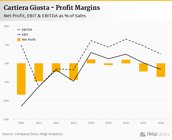 Cartiera Giusta made a net profit of EUR -0.758 mil with revenues of EUR 20.7 mil in 2018, down by 93.4% and up by 14.7%, respectively, compared to the previous year.