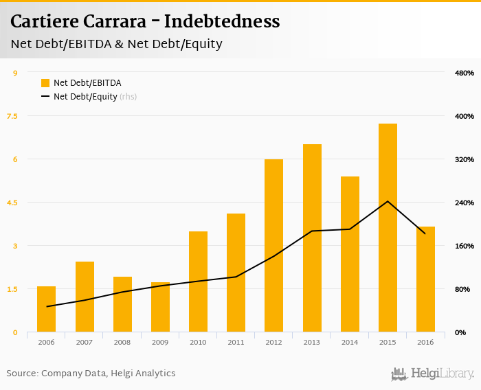 Cartiere Carrara's net debt stood at EUR 105 mil and accounted for 180% of equity at the end of 2016. The ratio is down 60.6 pp compared to the previous year.