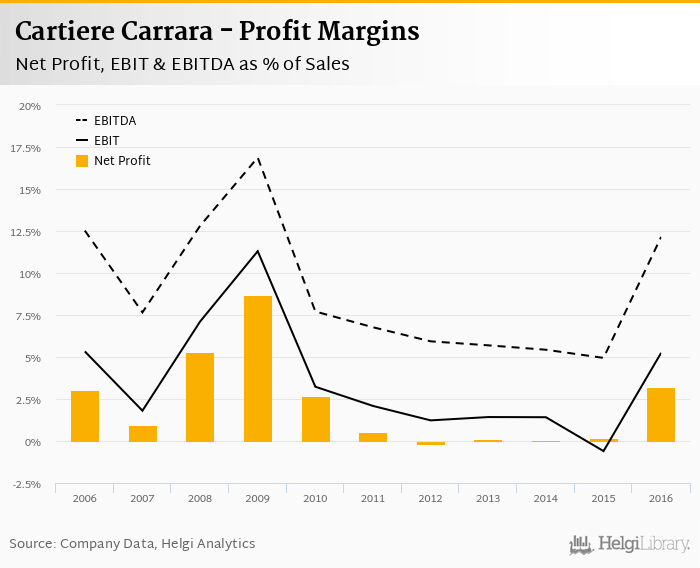 Cartiere Carrara made a net profit of EUR 7.59 mil with revenues of EUR 236 mil in 2016, up by 2.00% and up by 39.0%, respectively, compared to the previous year.