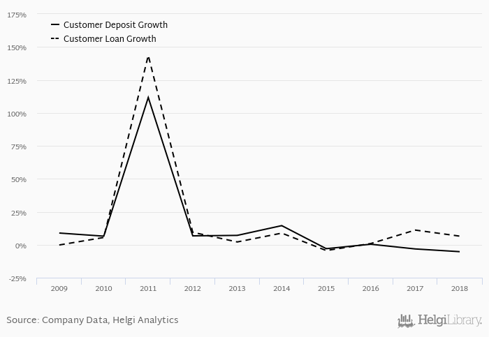 On the other hand, bank's customer deposit growth amounted to -5.27% at the end of 2018, down from -3.20% when compared to the previous year. Historically, the bank’s deposit growth reached an all time high of 112% in 2011 and an all time low of -5.27% in 2018. In the last decade, the average annual loan growth amounted to 0%.