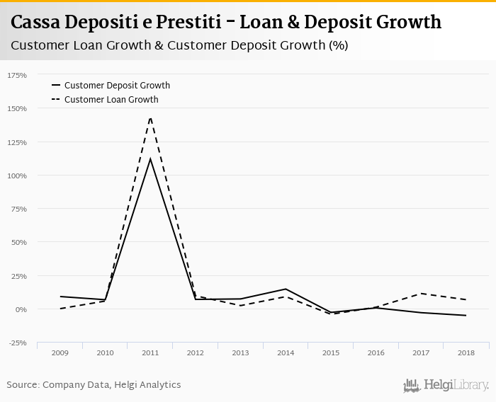 Cassa Depositi e Prestiti's customer loan growth reached 6.51% in 2018, down from 11.1% compared to the previous year. Historically, the bank’s loans growth reached an all time high of 144% in 2011 and an all time low of -4.41% in 2015. In the last decade, the average annual loan growth amounted to 0%.
