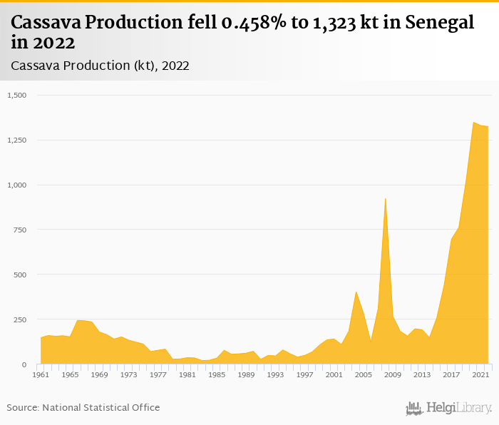Cassava production fell 0.458% to 1,323 kt in Senegal in 2022, according to Faostat.