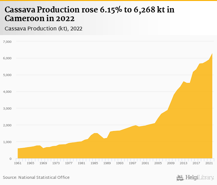Cassava production rose 6.15% to 6,268 kt in Cameroon in 2022, according to Faostat.