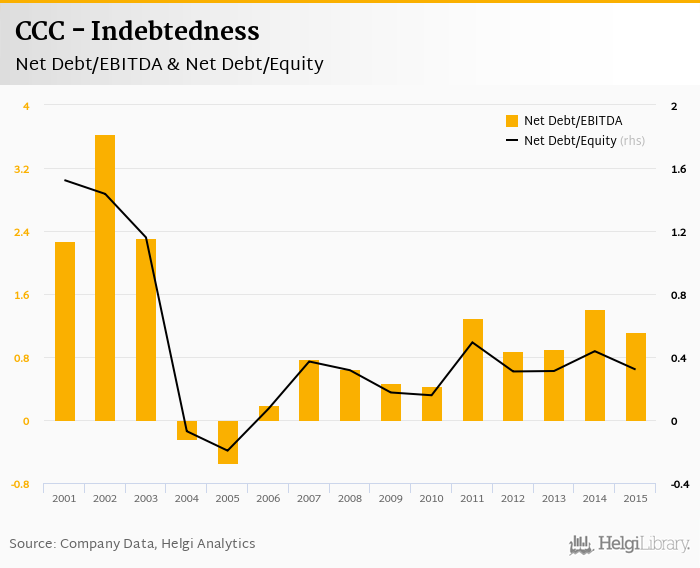 CCC's net debt stood at PLN 360 mil and accounted for 0.321 of equity at the end of 2015. The ratio is down 0.116 pp compared to the previous year.