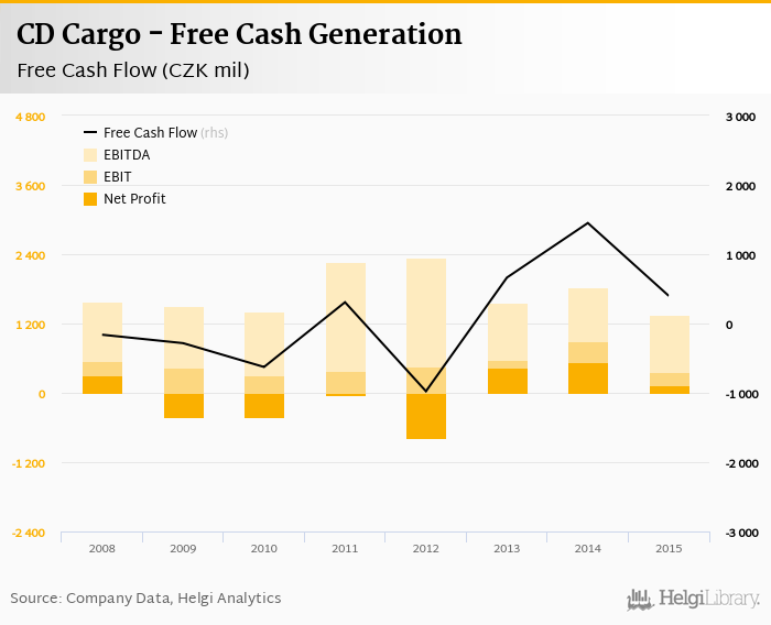 CD Cargo made a net profit of CZK 140 mil with revenues of CZK 11,990 mil in 2015, down by 73.9% and down by 1.24%, respectively, compared to the previous year. This translates into a net margin of 1.16%.