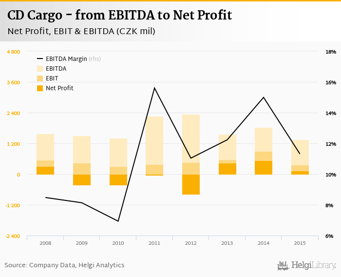 CD Cargo made a net profit of CZK 140 mil with revenues of CZK 11,990 mil in 2015, down by 73.9% and down by 1.24%, respectively, compared to the previous year. This translates into a net margin of 1.16%.